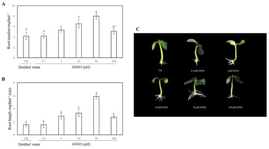 Effect of different concentrations of S-nitrosoglutathione (GSNO) on adventitious root development in cucumber explants. The primary roots were removed from hypocotyl of 5-day-old seedlings. Explants were incubated for 5 days with different concentrations of GSNO. The numbers (A) and root length (B) of adventitious roots were expressed as mean ± SE (n = 3). Ten explants were used per replicate. Photographs (C) were taken after five days of the treatments indicated. Bars with different lowercase letters were significantly different by Duncan’s multiple range test (p < 0.05). Bars with different lowercase letters were significantly different by Duncan’s multiple range test.