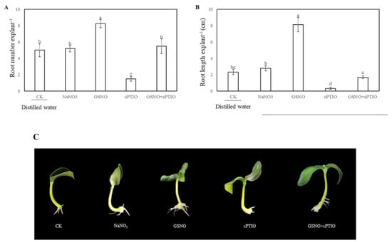 Effect of NO scavenger 2-(4-carboxy-2-phenyl)-4, 4, 5, 5-tetramethylimidazoline-1-oxyl-3-oxide (cPTIO) on adventitious root development in cucumber explants. The primary roots were removed from 5-day-old seedlings. Explants were then incubated for 5 days with distilled water (CK) or 100 μM sodium nitrate (NaNO3), 50 μM GSNO, 200 μM cPTIO, or 50 μM GSNO + 200 μM cPTIO. The numbers (A) and root length (B) of adventitious roots were expressed as mean ± SE (n = 3). Ten explants were used per replicate. Photographs (C) were taken after five days of the treatments indicated. Bars with different lowercase letters were significantly different by Duncan’s multiple range test (p < 0.05). Bars with different lowercase letters were significantly different by Duncan’s multiple range test.