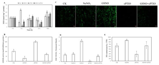 To further elucidate whether S-nitrosylation was involved in the process of adventitious rooting, the level of endogenous S-nitrosothiol (SNO) was tested during adventitious rooting (Figure 3A). As shown in Figure 3A, during adventitious rooting, treatment with GSNO strikingly elevated the endogenous SNO level. At 6 h, nitroso groups with GSNO treatment reached the maximum value and were significantly higher than that of cPTIO treatment. On the contrary, lower S-nitrosoglutathione reductase (GSNOR) activity was found in GSNO treatment relative to that of control or cPTIO treatment at 6 h (Figure 3B). Additionally, application of GSNO treatment significantly enhanced the fluorescent intensity of NO production in cucumber hypocotyl. Meanwhile, there was no significant difference between distilled water (CK) treatment and sodium nitrate (NaNO3) treatment (Figure 3C,D). However, the production of endogenous NO was remarkably reduced in hypocotyl after NO scavenger treatment (Figure 3).