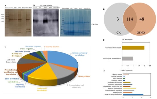Identification of S-nitrosylated proteins during the development of adventitious rooting. Total S-nitrosylated proteins were detected through liquid chromatography/mass spectrometry/mass spectrometry (LC-MS/MS) and the western blotting method after explants were incubated with distilled water (CK) or 50 μM GSNO, 200 μM cPTIO, or 50 μM GSNO + 200 μM cPTIO for 6 h (A, B). Functional categorization of S-nitrosylated proteins from CK, GSNO and GSNO + cPTIO treatment (C). The number of S-nitrosylated proteins in CK and GSNO treated explants (D). Functional categorization of S-nitrosylated proteins from CK treatment alone (E). Functional categorization of S-nitrosylated proteins from GSNO treatment alone (F).