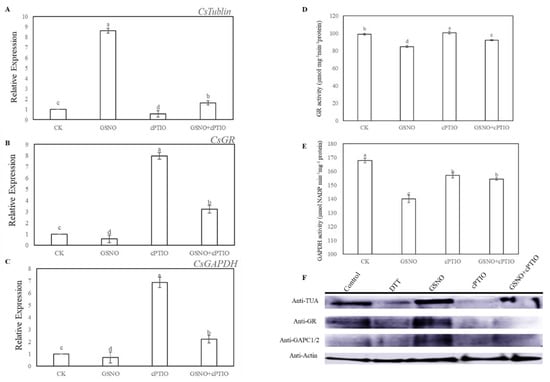 Effect of GSNO on the expression levels, enzymatic activities and S-nitrosylation level of tubulin alpha chain (TUA), glutathione reductase (GR), and glyceraldehyde-3-phosphate dehydrogenase (GAPDH) during adventitious rooting. Explants were incubated with distilled water (CK) or 200 μM cPTIO, 50 μM GSNO, or 50 μM GSNO + 200 μM cPTIO. TUA, GR and GAPDH expression level (A, B, C), and GR and GADPH activity (D, E) in cucumber explants was determined at 6 h of treatment. Immunoblot analysis of S-nitrosylated proteins in vivo (F). After biotinylation, proteins were purified with neutravidin-agarose, separated by sodium dodecyl sulfate-polyacrylamide gel (SDS-PAGE), and immunoblotted with anti-TUA, anti-GR, and anti-GAPDH antibodies. Bars with different lowercase letters were significantly different by Duncan’s multiple range test (p < 0.05). Bars with different lowercase letters were significantly different by Duncan’s multiple range test.