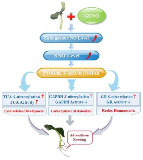 Schematic model of NO-induced S-nitrosylation during adventitious rooting in cucumber. NO-enhanced endogenous NO concentration and SNO levels, which triggers S-nitrosylation of proteins to induce adventitious root development. Differential S-nitrosylation of TUA, GAPDH and GR might regulate various pathways during NO-promoted the development of adventitious roots. The increase is indicated by the red arrow. The decrease is indicated by the blue arrow.