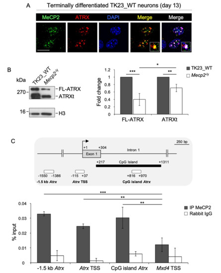 At first, we analyzed the subnuclear localization of MeCP2 and ATRX in terminally differentiated TK23_WT neurons by double immunostaining. For ATRX, we used 39f antibody that recognizes both FL-ATRX and ATRXt isoforms (Figure S1). We observed that MeCP2 and ATRX co-localize at chromocenters (Figure 1A), as previously observed in the brain [27], which suggests a possible functional interaction between these two proteins.