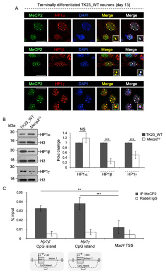 Both MeCP2 and members of the HP1 family are considered readers of specific epigenetic modifications, i.e., DNA and histone methylation, respectively. MeCP2 is known to interact with HP1s and to co-localize with them to chromocenters in several human and murine contexts [41,42,55].