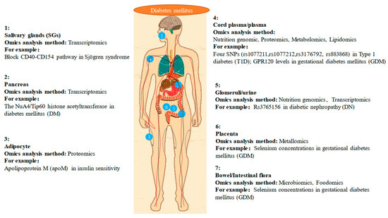 The incidence and prevalence of diabetes mellitus (DM) have increased rapidly worldwide over the last two decades. Because the pathogenic factors of DM are heterogeneous, determining clinically effective treatments for DM patients is difficult. Applying various nutrient analyses has yielded new insight and potential treatments for DM patients. In this review, we summarized the omics analysis methods, including nutrigenomics, nutritional-metabolomics, and foodomics. The list of the new targets of SNPs, genes, proteins, and gut microbiota associated with DM has been obtained by the analysis of nutrigenomics and microbiomics within last few years, which provides a reference for the diagnosis of DM. The use of nutrient metabolomics analysis can obtain new targets of amino acids, lipids, and metal elements, which provides a reference for the treatment of DM. Foodomics analysis can provide targeted dietary strategies for DM patients. This review summarizes the DM-associated molecular biomarkers in current applied omics analyses and may provide guidance for diagnosing and treating DM.