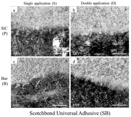 Sattabanasuk et al. [31] demonstrated that SiC papers produced more irregular surfaces and thicker smear layers than their bur-prepared counterparts when the effects of abrasives with similar coarseness were compared. They also observed that SiC-prepared smear layers were associated with lower bond strength values in those situations. Our bond strength results also showed a similar trend, regardless of the application mode and adhesive, which were further complimented by the TEM images (Figure 1, Figure 2 and Figure 3).
