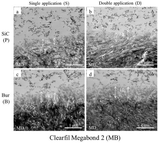 The degree of filler loading is also associated with the rheological property of the adhesive [44], which would, in turn, determine the thickness and characteristic of the hybrid layer. Our TEM images showed that the thicknesses of the hybrid layers created by the adhesives/primer ranged from a few hundreds of nm to about 1500 nm. Generally, the thicknesses were more uniform with the 180-grit SiC-prepared smear layers than those of the fine-grit diamond bur-cut preparations, the latter being slightly thicker and wavy in appearance. Irrespective of the type of smear layer, double application (D) resulted in a noticeable increase of hybrid layer thicknesses in the cases of GP (Figure 1b,d) and SB (Figure 2b,d). In spite of having the shortest application time among the three tested adhesives, GP created the thickest hybrid layers in double application (D) modes (≥ 1000 nm), probably due to 10-MDP, and for the presence of the additional monomers 4-META and MDTP, which makes GP more acidic than the others (Table 2). The hybrid layers created with SB were thinner than those of GP, ranging from 200–300 nm in single application mode (S) to 600–700 nm in double application mode (D). The thicker hybrid layers of SB with double application (D) were probably the result of its active and enhanced application mode, as it contains 10-MDP [37,38,39]. In case of MB, despite containing 10-MDP, hybrid layers ranged between 500–600 nm in the SiC-prepared dentin to approximately 800–900 nm in bur-cut dentin, implying that double application (D) modes did not yield marked changes from their single application (S) counterparts (Figure 3). This observation could be explained by MB’s mild acidic nature, together with its inactive application. Overall, the formation of the thicker hybrid layers is probably related to the chemical and rheological characteristic of the adhesive/primer, i.e., increased acidity and less viscosity, as well as the application mode, i.e., enhanced application time and application type (active or not). The thicker hybrid layers observed from the TEM images of fine-grit diamond bur-prepared dentin probably indicated that the corresponding 180-grit SiC-prepared smear layers were thicker, which might have hindered resin penetration more than with the bur-prepared dentin. However, these observations are contrary to previous reports, where the effects of SiC and bur-prepared smear layers were compared without emphasizing the similarity of their coarseness [22,23].
