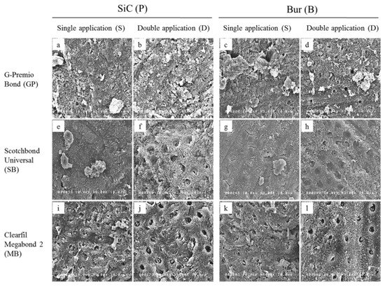 Representative SEM images (3000×) of 180-grit SiC paper-prepared (P) and fine-grit diamond bur-cut (B) dentin conditioned with the tested adhesives (GP and SB) and primer (MB) when applied in single (a,c,e,g,i,k) and double application mode (b,d,f,h,j,l).
