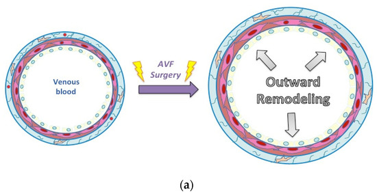 The venous wall is composed of three layers (Figure 2A) [12]. The external layer, called the adventitia, acts like a thin but resistant envelope to the vessel. It is composed of extracellular matrix (ECM), fibroblasts and immune cells. Vasa vasorum, small vessels, also run around the vein within the adventitia, to bring arterial blood flow to the venous wall [13]. The middle layer, called the media, is made of smooth muscle cells (SMC) and some extracellular fibers. The internal layer, also called intima, is composed of endothelial cells. During remodeling, hemodynamic changes and surgical injuries have an impact on all three layers of the venous wall. Endothelial and adventitial signaling induces, in turn, structural changes in the cells and the ECM, which affect the venous caliber and thickness (Figure 2B,C). Lack of outward remodeling and/or excess in wall thickening creates a disequilibrium that leads to AVF non-maturation and early failure (Figure 2D) [12].