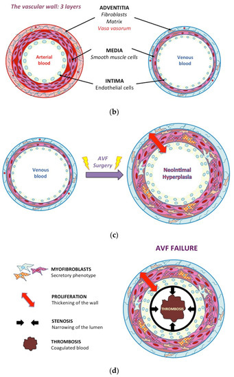 Wall thickening is the adaptation of the vessel wall to increased pressure and abnormal WSS. This process involves the expansion of all the vessel layers via ECM deposition, cell proliferation and migration [22]. The thickening of the venous wall composed of these matrix proteins and proliferative and secretive cells is called neointimal hyperplasia (NH). Excessive neointimal hyperplasia causes stenosis. As a consequence of stenosis, the blood flow may be diminished and the AVF becomes unusable for dialysis. In extreme cases, stenosis may cause thrombosis, a complete occlusion of the vessel because of non-circulating blood (Figure 2D). Several types of cells are involved in NH, including ECs, SMCs, and adventitial fibroblasts [23].