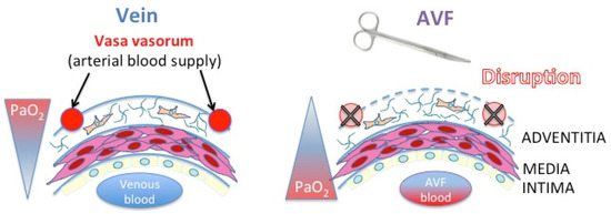 Hemodynamic changes and surgery-induced mechanical injury to the venous wall have been proposed as the etiology of juxta-anastomotic stenosis and maturation failure of AVF; however, a more recent theory proposes that hypoxia and oxidative stress may also play a role. Starting from the observation that during traditional AVF creation the vein is dissected free from the surrounding tissue, and that this same dissected segment is responsible for the majority of stenosis, researchers hypothesized that the rupture of the vasa vasorum during surgical dissection may induce hypoxia, low oxygen (O2) concentration, in the venous wall [12,34] (Figure 3). Additionally, the O2 partial pressure (pO2) in the venous blood is approximately 35–45 mmHg. However, after AVF creation, pO2 in the fistula increases to the level of arterial pO2 (73–100 mmHg). Thus it is possible that interruption of the arterial blood supply followed by the sudden increase in luminal pO2 causes an ischemia-reperfusion phenomenon within the venous wall. Both of these phenomena provoke oxidative stress and stimulate numerous signaling pathways [36]. Interestingly, Joddar et al. have shown that arterial levels of oxygen stimulate NH in veins via a ROS-dependent mechanism [55]. In addition, two computational studies suggest that hypoxic segments of vessels may be linked to hemodynamic patterns and may correlate with stenosis [56,57]. Thus the two pathophysiological theories, flow and ischemia, may be related.
