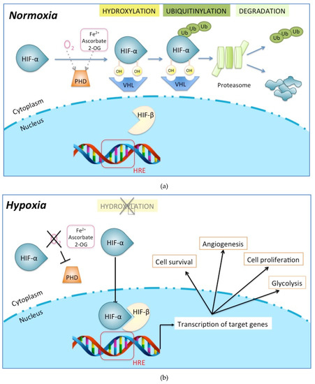 The discovery of molecular mechanisms behind oxygen-dependent regulation of HIFs was rewarded in 2019 by the Nobel Prize in Physiology or Medicine. In well-oxygenated cells, the HIF-α subunits are constantly and rapidly degraded by hydroxylation of proline residues within the oxygen-dependent degradation domain of HIF-α, with one of the shortest half-lives (less than 5 min) among cellular proteins (Figure 4A) [59,61,62]. Prolyl hydroxylation targets the HIF-α proteins for proteasomal degradation by promoting their interaction with the protein von Hippel-Lindau (pVHL) (Figure 4A) [59,61,63,64,65]. This post-translational modification of HIF-α is carried out by a family of prolyl hydroxylase enzymes, the prolyl hydroxylase domain proteins (PHD1, PHD2, PHD3) (Figure 4A) [61,62,66]. Since these enzymes bind oxygen directly, they are critical oxygen sensors within the hypoxic response pathway [67]. In hypoxia, these enzymes being inactivated, HIF-α proteins are not degraded and accumulate in cells (Figure 4B) [68]. An additional hydroxylation of an asparaginyl moiety at the end of the COOH-terminal transactivation domain of HIF-1α or HIF-2α subunit is catalyzed by an enzyme called factor-inhibiting HIF-1 (FIH-1) [69,70]. In normoxia, FIH-1 abrogates HIF transcriptional activity by inhibiting the binding of coactivators such as p300 and C-AMP Response Element-binding protein [71,72,73]. Under hypoxia, PHD inactivation causes HIF-α accumulation, and FIH-1 inactivation allows HIF transcriptional activity. While the HIF-β/ARNT subunits are constitutively expressed in the nucleus, the HIF-α subunits found in the cytoplasm have sensitivity towards O2. When the HIF-α subunit is stabilized and active, it leaves the cytoplasm to enter the nucleus, binds its β-subunit and cofactors, and induces the transcription of a large number of genes (1–2% of all human genes) (Figure 4B) [61]. All these genes have in common a hypoxia-responsive element (HRE: 5′ -RCGTG-3′) as an enhancer, either in their promoter, in the 3′ untranslated region, or in introns [58,59,60,61,62,63,64,65,66,67,68,69,70,71,72,73,74,75,76]. These genes have key biological roles such as cell survival (ADM [77], cyclin D1 [78], BNIP3 [79], NIX [80]), cell proliferation (cyclin G2 [81], IGF2 [82], TGFα [83], NOS2 [84]), cell motility (AMF/GPI [83], LRP1 [81]), cytoskeletal structure and ECM (vimentin [83], some keratins [83]), erythropoiesis (EPO) [85], pH regulation (carbonic anhydrase 9 and 12) [86], nucleotide metabolism (adenylate kinase 4) [87]), amino acid metabolism (transglutaminase 2) [81], iron metabolism (transferrin [88], ceruleoplasmin [89]), and glucose and energy metabolism (HK2 [90], GLUT1 [91], GAPDH [92], LDHA [93], leptin [94]).
