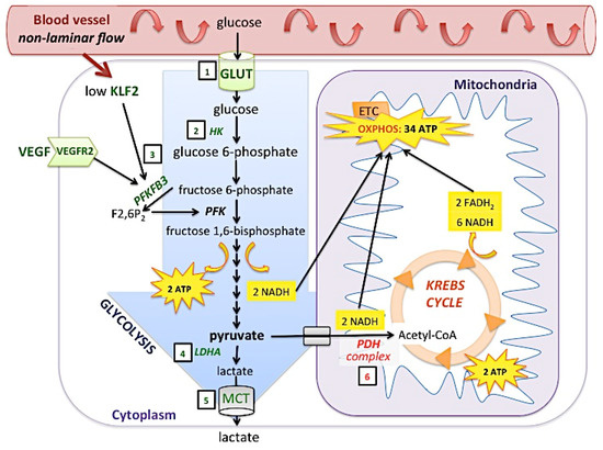 Glucose metabolism is regulated by hypoxia-inducible factors (HIFs). During glycolysis, glucose enters the cytoplasm through the glucose transporter (GLUT) and is transformed into glucose 6-phosphate by hexokinase (HK). Eight successive enzymatic reactions then occur to produce 2 molecules of pyruvate, 2 ATP and 2 NADH. At the end, cytosolic pyruvate has two possibilities: transformation into lactate by the enzyme lactate dehydrogenase A (LDHA)—lactate being then exported through the monocarboxylate transporter (MCT), or transferred into the mitochondria and transformed into Acetyl-CoA via the pyruvate dehydrogenase complex (PDH complex). In the second option, Acetyl-coA goes into the Krebs cycle to produce 2 ATP, 6 NADH, and 2 FADH2. NADH and FADH2 will further be used in redox reactions in the electron transport chain (ETC) to produce more ATP via oxidative phosphorylation (OXPHOS). HIF intervenes in several steps during glucose metabolism: by inducing GLUT it allows more entry of glucose (1) and by inducing hexokinase (2) and PFKFB3 (3), it enhances glycolysis. Note that non-laminar blood flow decreases the expression of Kruppel-like factor 2 (KLF2), which has otherwise an inhibitory action on HIF-1 and PFKFB3 expression. VEGF and its receptor VEGFR2 are also induced by HIF-1 and enhance PFKFB3 expression. Further, pyruvate is pushed towards lactate transformation by up-regulation of LDHA (4) and some isoforms of MCT (5). At the same time, HIF prevents the PDH complex from transforming pyruvate into Acetyl-coA (6). Green: activation by HIF, Red: inhibition by HIF.