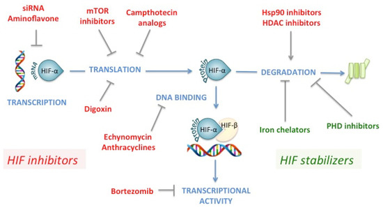According to their putative mechanism of action, HIF inhibitors can be divided into agents that modulate (Figure 6):