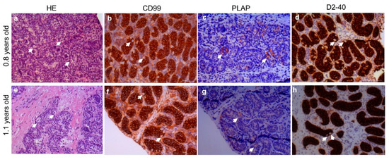 Hematoxylin and eosin (HE) staining and immunohistochemistry by CD99, PLAP and D2-40 in undescended testis aged 0.8 and 1.1 years old, respectively. HE staining (a,e); CD99 immunohistochemistry (b,f); PLAP immunohistochemistry (c,g); D2-40 immunohistochemistry (d,h); Arrows show the germ cells. CD99: cluster of differentiation 99; PLAP: placental alkaline phosphatase, D2-40: podoplanin; Scale bars: 100 µm.