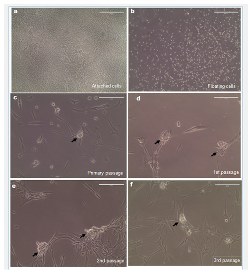 Spermatogonial stem cell (SSC)-like cell clusters were continuously formed in vitro. (a) The attached cell from the first plate formed confluence after 12 days. (b) SSC-enriched fractions (floating cell in first plates) was subsequently cultured in the StemPro-34 stem cell xeno-free media. (c–f) SSC-like cell clusters were formed in primary, first, second and third passages derived from SSC-enriched fractions cultured in xeno-free media. Arrows show the SSC-like cell clusters. Scale bars: 200 µm.