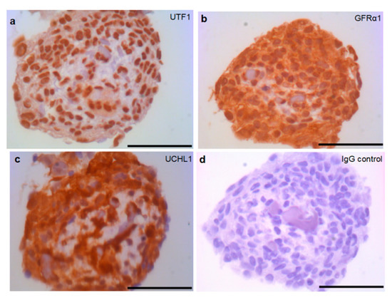 SSC-like cell clusters express SSC markers. Immunostaining of cross sections of SSC-like cell clusters by (a) undifferentiated embryonic cell transcription factor 1 (UTF1), (b) GDNF family receptor alpha-1 (GFRα-1), (c) ubiquitin carboxyl-terminal hydrolase isozyme L1 (UCHL1), and (d) IgG negative control. Scale bars: 50 µm.