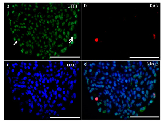 SSC-like cell clusters contain a few proliferating cells. Double immunofluorescence staining of SSC-like cell clusters (a) undifferentiated embryonic cell transcription factor 1 (UTF1); (b) antigen KI-67 (Ki67); (c): nuclear staining with 4′,6-diamidino-2-phenylindole (DAPI); (d) merged from three channels. Arrows showing the proliferating cells in the surface layer of clusters. Scale bars: 50 µm.