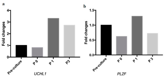 SSC-like cell clusters transcribe the message RNA of SSC markers during passaging. (a) Real-time quantification of the expression level of the SSC markers, ubiquitin carboxyl-terminal hydrolase isozyme L1 (UCHL1) and (b) promyelocytic leukaemia zinc finger protein (PLZF) during passaging. Pre-culture: the digested testicular cells. P0: Primary passage. P1: First passage. P3: Third passage.