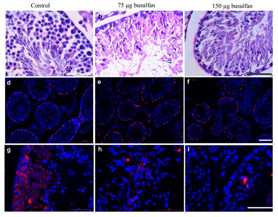 Testis from nude mice sterilized by intratesticular busulfan injection. a–c: Cross sectional histological analysis of mouse testis by periodic acid–Schiff (PAS) staining. (a) nontreated control (b) two weeks after intratesticular busulfan injection with either 75 µg or (c) 150 µg. Scale bar: 50 µm. d–f: Cross sectional immunofluorescent analysis of mouse testis by Sertoli cell marker SRY-Box 9 (SOX9; red) and DNA visualization by DAPI staining (blue) (d) non-treated control (e) two weeks after intratesticular busulfan injection with either 75 µg or (f) 150 µg. Scale bar: 100 µm. g–i: Cross sectional immunofluorescent analysis of mouse testis by germ cell marker VASA (red) and DNA visualization by DAPI staining (blue) (g) non-treated control (h) two weeks after intratesticular busulfan injection with either 75 µg or (i) 150 µg. Scale bar: 50 µm.
