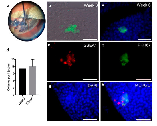To verify SSC identity after propagation, xenotransplantation was performed. A total number of 13 million cells were collected after 2.5 months propagation with 3 passages and pre-labelled with green fluorescent cell linker PKH67. Around one million labelled cells were transplanted into seminiferous tubules of each testis via the efferent duct (Figure 7a). The colonies of PKH67 labelled cells in seminiferous tubules of the recipient mice were identified after 3 and 6 weeks (Figure 7b,c). The number of colonies was quantified as around 11 colonies (more than four cells in one cluster) with per million transplanted cells after three and six weeks (Figure 7d). Whole-mount testicular immunostaining showed that the SSC marker stage-specific embryonic antigen-4 (SSEA4) was expressed in PKH67 positive colonies (Figure 7e–h), indicating the successful migration of donor cells onto the basement membrane of seminiferous tubules in recipients.