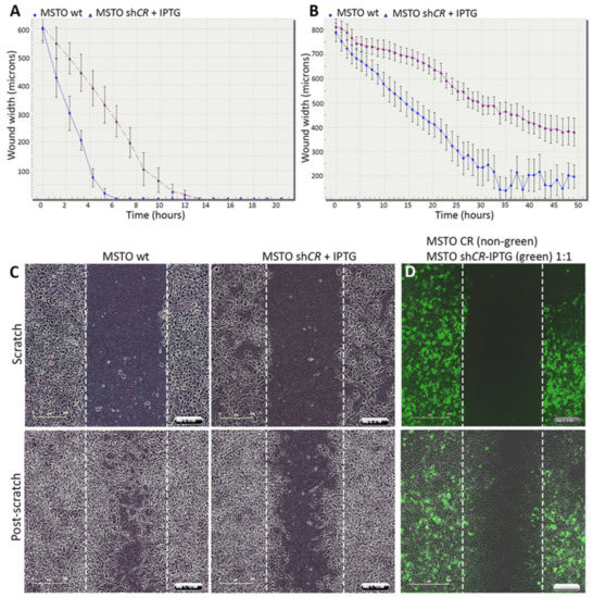 As CR is known to increase migration and invasion of MSTO-211H cells in vitro [24], MSTO-shCALB2-IPTG (induced) cells were used to investigate, whether a near lack of CR would affect the cell’s migratory and invasive capacity. Migration was tested in the prototypical scratch wound assay. A scratch of about 1 mm was made and the closure of the wound was measured using the time-lapse Incucyte™ imaging system. After IPTG induction, cells with decreased CR levels showed a slower migration rate (closure of the scratch after 12-13 h), when compared with MSTO-wt cells (showing an average of 6 h for total wound closure; Figure 2A). Cell invasion was measured as the ability of the cells to invade a Matrigel-filled gap (0.6 mg/mL Matrigel) generated in the scratch wound assay. Neither MSTO-wt nor MSTO-shCALB2-IPTG (induced) cells were able to completely close the wound after 50 h (Figure 2B); nevertheless, the latter cells were discernibly characterized by a decreased invasive phenotype/capacity compared to the corresponding MSTO-wt cells that almost completely closed the gap by invasion through the Matrigel matrix (Figure 2C).
