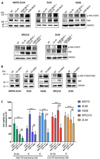 In view of the above findings, we investigated the possible interplay between the FAK and Wnt signaling pathways in different MM cell lines independently of CR expression levels or of modulation by CR. FAK is known to modulate Wnt in a complex and dynamic manner in different cell types working either upstream or downstream of Wnt signaling, and at times even synergistically [40]. For these experiments we used three MM cell lines derived from epithelioid (ZL55, H226) or biphasic (MSTO-211H with mostly epithelioid morphology and characteristics) MM, and two cell lines consisting completely (ZL34) or predominantly (SPC212) of cells with sarcomatoid morphology. In the presence of the Wnt inhibitor 3289-8625, levels of p-FAK (Tyr397) were increased in all cell lines (in SPC212 and ZL34 cells seen as the difference between Cis-Pt alone and Cis-Pt + 3289-8625) indicating universal activation of the FAK signaling pathway (Figure 5A). Unlike in the “sarcomatoid” lines SPC212 and ZL34, co-addition of Cis-Pt had no significant effect on p-FAK (Tyr397) levels in ZL55, H226 and MSTO-211H cells. Treatment with Cis-Pt alone did not reveal a congruent picture: a weak up-regulation in SPC212 cells, a small decrease in MSTO-211H and ZL55 cells and no obvious changes in the others. Conversely, treatment with the FAK inhibitor VS-6063 (5 µM) strongly increased p-JNK (Thr183/Tyr185) and total JNK levels in all cell lines except ZL34 (Figure 5B). Quantitative analyses of the normalized p-FAK, total FAK and p-JNK, total JNK signals are shown in Figure S3.