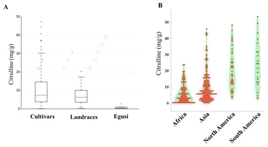 The current research aimed to analyze citrulline content evolution by using GBS-generated SNPs across the global collections of sweet watermelon, landraces, and egusi types. Watermelons were cultivated in the northeast of Africa around 5000 years ago [35]. Pictures on Egyptian frescos and seeds found in the grave of King Tutankhamun indicated that the flesh of watermelons was still white and tasted bland [36]. These bland vegetable-kind watermelons were cultivated for thousands of years before sweet watermelons arose [37]. Depictions of cut watermelons throughout the centuries (Giovanni Stanchi 1608 to c. 1675) deviated from the modern watermelons. When explored through flesh of landraces, one can find the evidence for these anthropological records. Because of this, in the current study, landraces are named as semi-wild as the sweet watermelons are quite different. Modern watermelon provides a large amount of water and nutrients, such as sugars, carotenoids, lycopene, minerals, and amino acids, including citrulline. Although citrulline is the most abundant free amino acid in watermelon [12], because of the crop’s commercial value, genetic mapping efforts have mostly focused on sugar content [38,39]. During domestication, dessert watermelons were mostly selected for qualitative traits such as sweetness, flesh color, and rind pattern [40]. Although primitive dessert watermelon landraces, with naturally low sugar content, were expected to be valuable sources of bioactive compounds [41], our study demonstrates that citrulline content is, in general, lower in landraces and egusi types. Modern cultivars from the Americas that are rich in citrulline may have acquired the trait inadvertently during the selection for sweetness or the trait might have an unknown role in adaptation. A positive correlation of sugar content with citrulline was demonstrated in modern watermelon cultivars [18,21,22]. The distinctness of American, European and Asian ecotypes has been described in watermelons [29,42,43], but an independent parallel phenotypic evolution for citrulline during domestication cannot be ruled out [44].