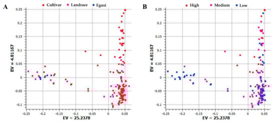 Principal component analysis (PCA) based on the first two components showing the distribution of (A) cultivars, landraces, and egusi types; (B) and low, medium, and high citrulline content in 187 watermelon accessions by using 1410 single nucleotide polymorphisms (SNPs) generated by genotyping by sequencing. Each dot represents an accession. EV indicates the percentage of explained variance.