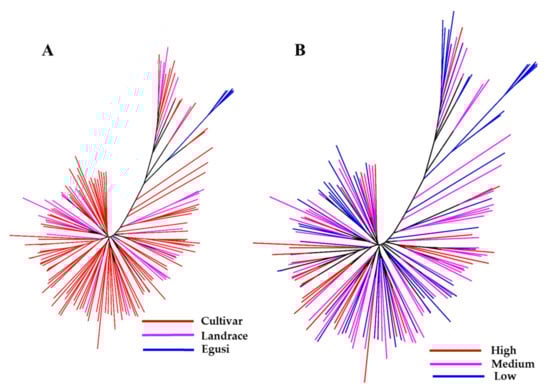 Using the final SNP dataset, we constructed an unrooted neighbor-joining (NJ) tree to infer phylogenetic relationships and understand the distribution of citrulline content across the C. lanatus accessions (Figure 3A,B). One group (colored blue in the tree) represents the entire egusi collections. The pink- and red-colored clades represent sweet watermelons and landraces (most from South Africa), many with a hard rind and white flesh resembling an intermediate between egusi and sweet watermelon. This study indicated that most low to medium citrulline-content types are egusi and landraces.