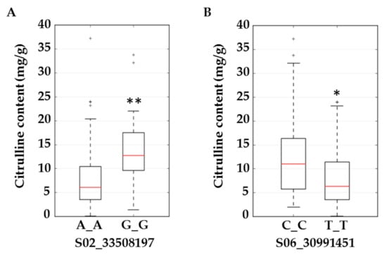 Boxplots for citrulline content (mg/g) in flesh tissue at SNP S02_33508197 located in the intron of ferrochelatase (A) and S06_30991451 located in an exon of acetolactate synthase (B). Significant differences (based on the Kruskal–Wallis test) with p ≤ 0.01 and p ≤ 0.05 are marked with two (**) and one (*) asterisks respectively.