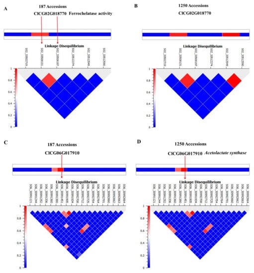 We selected ferrochelatase (FC) and acetolactate synthase (ALS) genes for further validation. Allelic effects of SNPs located in these genes are in Figure 4. S02_33508197 is located in the intron of FC. Allele frequencies for S02_33508197 were 0.83 for AA and 0.17 for the minor allele GG. Average citrulline content was 5 mg/g for the AA-containing genotype and 12.5 mg/g for the GG-containing genotypes (Figure 4A). S06_30991451 is located in an exon of ALS and a non-synonymous mutation causing N→S with allele frequencies for TT and CC of 0.79 and 0.21, respectively. Allelic effects for major (TT) and minor (CC) alleles can be noted from the box plot (Figure 4B). Strong LD is noted around the associated SNPs in Figure 5A,C. LD around these two genes was further confirmed from a robust set of 1250 accessions (Figure 5B,D) in a recently published study [26].