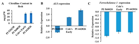 (A) Citrulline content and expression of candidate genes in flesh of selected watermelon accessions. Data are means ± SD (n = 3). (B) Expression of acetolactate synthase (ALS) and (C) Ferrochelatase 1 genes in flesh. PI 526238 accession, with low citrulline content, was used as a calibrator for relative expression in (A). Gene expression was normalized to that of Actin 8. Data are means ± SD (n = 3).