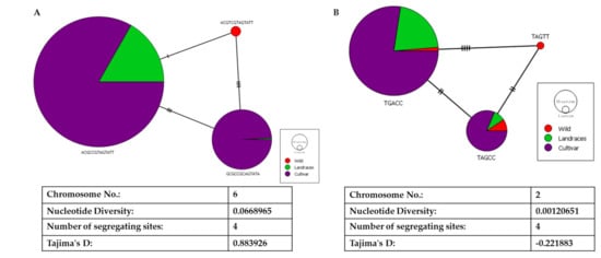 With the four segregating sites in the LD block in ALS, we could build a network of haplotypes for egusi (wild), landraces, and cultivated watermelon (Figure 7A). Haplotype ACGTCGTAGTATT had undergone a single nucleotide change to form a landrace haplotype (ACGCCGTAGTATT). GCGCCGCAGTATA has three segregating sites as compared with the landrace haplotype and four segregating sites as compared with the wild haplotype. We noted Tajima’s D as 0.88 and nucleotide diversity of 0.07, indicating a high degree of positive selection around this gene. Contrastingly, for the other causal gene FC, we noted reduced nucleotide diversity of 0.01 and negative Tajima’s D (−0.221) indicating purifying selection in evolution (Figure 7B).