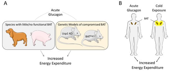 In humans, the question whether glucagon acutely activates BAT was recently investigated in eight young men selected for active BAT, as determined by 18F-fluorodeoxyglucose positron emission tomography/CT (18F-FDG PET/CT) during a cold challenge. In these BAT-positive subjects, glucagon infusion (50 ng/kg/min for 55 min) increased energy expenditure by 230 kcal/day without an observed increase in BAT activity []. Collectively, these data further corroborate that glucagon effects on energy expenditure are BAT independent (Figure 1).