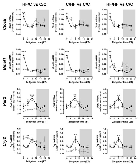One of the key components in nutritional homeostasis is the maintenance of daily rhythms in sleep–wake cycle, locomotor activity, feeding behavior, and energy metabolism across the 24 h (circadian) light/dark cycle, which is actively coordinated by a central circadian clock located in the suprachiasmatic nucleus (SCN) of the hypothalamus [3]. The molecular basis of circadian oscillations is composed of positive and negative transcriptional–translational feedback loops [4,5,6]. The process starts with the dimerisation of the CLOCK and BMAL1 proteins that bind to a specific E-box regulatory element in the promoter of the clock genes Period (Per) and Cryptochrome (Cry) to induce transcription. These transcripts then produce proteins that form dimers after translation to repress their transcription by competing with CLOCK/BMAL1 binding. Following the degradation of the inhibitory proteins, this transcription–translation feedback loop starts over for another circadian cycle. The link between the molecular circadian clock in the SCN and metabolism has been elucidated by well-documented studies in Clock-deficient mice, which exhibited obesity and hyperphagia [7,8]. More recent studies have shown that an obesogenic high fat (HF) diet leads to disruption in circadian locomotor activity, food intake, and hepatic clock gene expression [9,10].