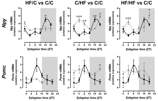 ANOVA analysis show significant difference in Npy gene expression between the C/C offspring vs. the HF/C offspring at ZT16 (p < 0.05), vs. the C/HF offspring at ZT4 (p < 0.001), ZT8 and ZT16 (both at p < 0.01), and at ZT20 (p < 0.05, and vs. the HF/HF offspring at ZT4 (p < 0.001) and at ZT20 (p < 0.05). Two-way ANOVA revealed that postweaning HF diet consumption had the main effect on the observed variance (p < 0.01), but there was also a significant interaction of maternal obesity and postweaning HF diet consumption (p < 0.01) on the overall variance. ANOVA analysis of Pomc gene expression showed significant difference between the C/C offspring vs. the HF/C offspring at ZT8 (p < 0.05), and vs. the HF/HF offspring at ZT20 (p < 0.05). Two-way ANOVA revealed that postweaning HF diet consumption had the main effect on the variance (p < 0.05) but with no interaction between maternal obesity and postweaning HF diet consumption.