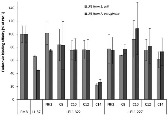 The binding affinity of PMB to LPS was set to 100% and compared to the affinities of the various AMPs. All tested AMPs showed an affinity to LPS in an aqueous environment (Figure 1). From the LF11-322 peptides, the non-acylated and C8-C12 substituted peptides showed a binding affinity between 75% and 102% compared to PMB. Only the C14 acylated peptide loses its affinity to LPS, which is only 22%–26%, due to the long acyl chain. The reason for this could be that this strongly hydrophobic peptide forms stable micelle-like structures in an aqueous environment. This would result in almost no monomers being available for the LPS binding. From the LF11-227 peptides, the C10-substituted showed a significant increase in affinity to LPS (92%–109%). The other LF11-227 peptides showed a similar LPS affinity between 61% and 82%. There was no big difference in the affinity of the peptides to the different LPS molecules (E. coli vs. P. aeruginosa).