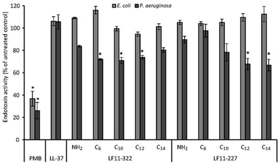 Polymyxin B is known to be able to strongly reduce endotoxin activity by binding to LPS through the formation of the LPS-PMB complex in blood []. The LAL test was used to show whether synthetic peptides, which show a high affinity to LPS in aqueous solution, also possess this ability in human plasma. Therefore, 500 ng/mL AMP, LL-37 and PMB were added to serum spiked with 5 ng/mL LPS of E. coli and P. aeruginosa. Endotoxin activity was determined by the LAL test. Several AMPs show a binding affinity as high as PMB in an aqueous solution (Figure 1), but PMB outperforms all AMPs regarding the reduction of LAL activity in human serum (Figure 2). PMB was able to reduce the endotoxin activity of E. coli LPS by 63 ± 7% and of P. aeruginosa LPS by 74 ± 7%. The AMPs were only able to reduce the endotoxin activity of LPS derived from P. aeruginosa. A significant (p < 0.05) reduction of the endotoxin activity in serum was observed by the C12 and C14 acylated LF11-227 peptides and by the C8-C12 acylated LF11-322 peptides. The highest reduction of the endotoxin activity was caused by LF11-227-C14 (37 ± 5%).