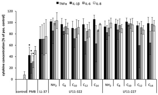 Cytokine levels of endotoxin-spiked blood treated with various AMPs in comparison to the untreated control. Blood without additives served as negative control and blood only with LPS served as positive control. The cytokine level of the positive control was set to 100% and the cytokine concentrations of the samples were compared. The bars marked with * show a significantly (p < 0.05) lower cytokine level than the positive control (n = 3).