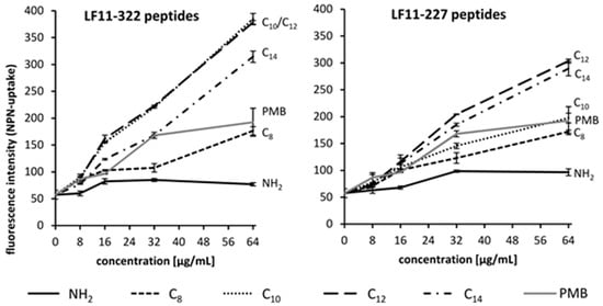 To determine whether the AMPs can permeabilize the outer membrane of Gram-negative bacteria, the AMP induced 1-N-Phenylnaphtylamine (NPN) uptake was determined. NPN is a hydrophobic fluorescent dye whose fluorescence emission is improved in an environment of glycerophospholipid []. A rising fluorescence signal therefore means a destabilization, destruction, or loss of the outer membrane of Gram-negative bacteria. Overall, the NPN uptake study shows that N-acylated peptides interact more strongly with the outer membrane of E. coli than non-acylated peptides (Figure 4). The highest fluorescence increase was achieved by the use of C12 acylated peptides, suggesting that these peptides cause the strongest destabilization to the outer membrane. This indicates that AMPs with longer lipid lengths interact more strongly with the outer membrane of E. coli but has its optimum with C12 acylation. The use of C14 acylated peptides resulted in a lower NPN uptake compared to C12 acylated peptides.