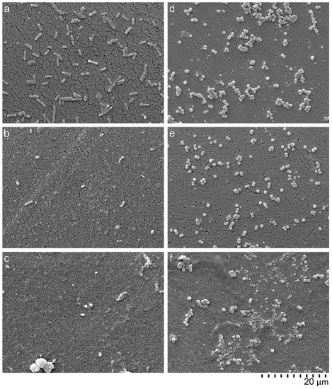 Scanning electron microscope (SEM) images from overnight cultures of E. coli (a–c) and S. aureus (d–f). Bacteria suspensions incubated without peptides (a,d), incubated with 128 μg/mL PMB (b,e), and incubated with 128 μg/mL AMP (LF11-322-C8) (c,f).