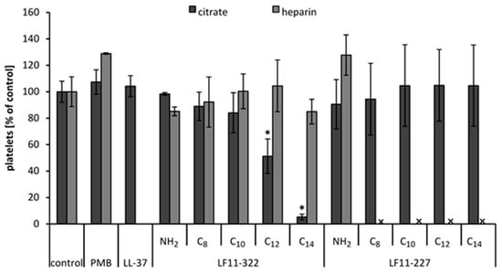 Influence of AMPs on platelets. PRP, anticoagulated with heparin or citrate, was incubated with 128 μg/mL AMP, PMB and LL-37. After 2 h, incubation platelets were counted. PRP without AMPs served as control and was set to 100%. The bars marked with * show a significantly (p < 0.05) lower platelet count than the control. x marks the peptides which caused precipitates in heparinized PRP and therefore meant that a platelet count was not feasible (n = 3).