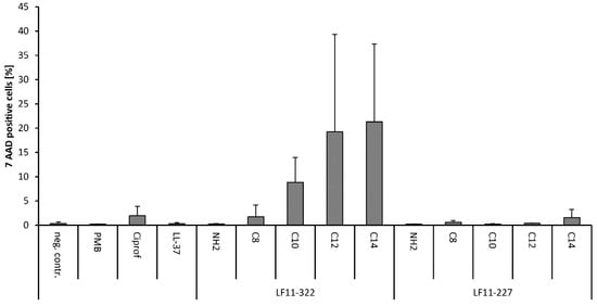 In order to determine whether the AMPs destabilize the membrane of leukocytes and thus destroy them, whole blood was spiked with 128 μg/mL AMP. After an incubation period of 120 min, the viability of the leukocytes was measured by flow cytometry. In addition to the AMP samples, the antibiotics ciprofloxacin and PMB were tested. Among the conventional antibiotics, only ciprofloxacin showed a cell-lysing effect on leukocytes (Figure 8). However, it should be noted that the serum level of ciprofloxacin during clinical treatment is about 3 μg/mL. The concentration used in this experiment was 128 μg/mL, which is 40 times higher than the recommended dose. However, the cytotoxic and cytostatic effects of ciprofloxacin on leukocytes, in particular on T cells, are known []. In the tested AMPs only the LF11-322 peptides showed strong cytotoxic effects on leukocytes in whole blood. As shown in Figure 8, the number of dead leukocytes increases with the acyl chain length of the peptide. The non-acylated peptide has no cytotoxic properties on leukocytes. The highest percentage of dead leukocytes was induced by the LF11-322-C14 peptide with 21 ± 16%.