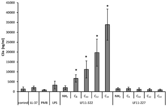 In order to check whether the AMPs activate the complement system in addition to coagulation, a separate batch test was performed. There are three different pathways of complement activation: the classical pathway, the alternative pathway, and the lectin pathway. In all three pathways, the active complement factor C3a is formed. Therefore, C3a was analyzed as an indicator of whether and to what extent the complement system is activated by the addition of AMPs. The results clearly show that the complement system of the LF11-322 peptide is activated only by acylated peptides (Figure 9). Similar to plasmatic coagulation, the activation of the complement system depends on the acyl chain length. The highest C3a level was achieved by LF11-322-C14. The other peptides tested did not increase C3a levels compared to the control.