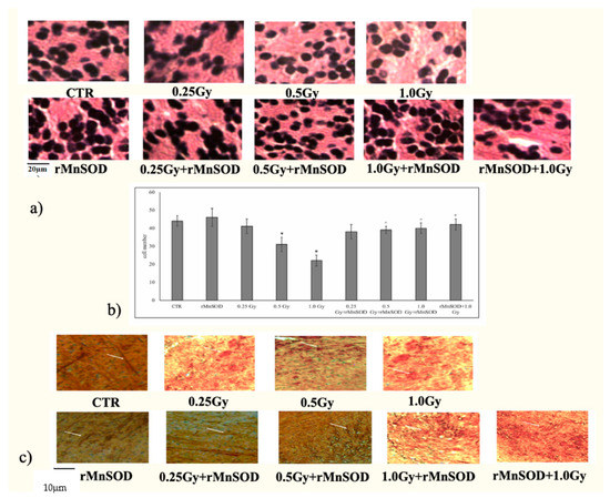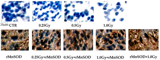 Data were expressed as means ± SD and their significance was checked by ANOVA test. Significance: (a) * p < 0.05 irradiated samples versus not-irradiated control sample (CTR); (b) & p < 0.05 irradiated and rMnSOD-treated samples versus rMnSOD-treated sample (rMnSOD); (c) ^ p < 0.05 irradiated and rMnSOD-treated samples versus respective irradiated samples; (d) ° p < 0.05 rMnSOD-pretreated and 1.00 Gy irradiated sample versus 1.00 Gy irradiated sample; (e) § p < 0.05 rMnSOD-pretreated and 1.00 Gy irradiated sample versus 1.0 Gy irradiated and rMnSOD-treated sample.