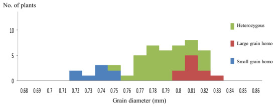 Distribution of mean value of grain diameter in 50 F3 line derived from the cross, Koshihikari × Inochinoichi. F3 lines segregated in a ratio of 10 large grain homozygous lines:32 heterozygous lines:8 small grain homozygous lines, which fit to the theoretical single gene ratio.