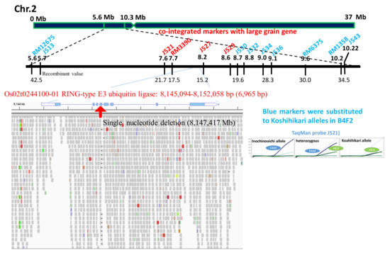 Whole-genome sequencing detected a single nucleotide deletion (adenine) from the Koshihikari genome at the 8,147,417 bp position from the distal end of the short arm of chromosome 2 (Figure 3). This was the same as a single nucleotide deletion reported in the fourth exon of GW2 (Os02g024410), the QTL gene responsible for grain width in the large grain Chinese rice WY3 [4]. GW2 encodes a RING protein with E3 ubiquitin ligase activity, and a frame shift caused by a nucleotide deletion in this gene causes a loss-of-function [4]. GW2 derived from Inochinoichi is 6,965 bp with 100% identical to that of WY3, i.e., a single deletion in the fourth exon. There are two SNPs that flank the coding region of the hydroquinone glucosyltransferase gene (Os02g0242900). Our results show that the gene responsible for the large grain size of Inochinoichi, a promising gene source for increasing yield, is GW2. DNA markers around GW2, namely from the distal end of the short arm of chromosome 2, RM12675(5.6 Mb), J513(5.7 Mb), J530(8.7 Mb), J532(8.8 Mb), J534(9.0 Mb), J536(9.1 Mb), RM6375 (9.6 Mb), and RM1358 (10.2 Mb) were substituted to Koshihikari alleles in the B4F2 (Figure 3). On the contrary, Inochinoichi alleles of J521 (7.6 Mb), RM3390 (7.7 Mb), J527 (8.2 Mb), J529 (8.6 Mb) were tightly inherited together with GW2.