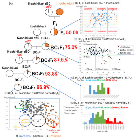 The first backcross with Koshihikari was conducted with a large grain semi-dwarf plant (stalk length: 76 cm, grain diameter: 0.8 mm) as the nonrecurrent parent segregated in the F2 between Koshihikari d60 (which was developed by integrating the Hokuriku 100-derived semidwarfing gene d60 into the Koshihikari genome through seven times of backcrosses) and Inochinoichi (Figure 4A,B). Here, regarding the genetics of d60, in the F1 hybrid (genotype D60d60Galgal) of Koshihikari (D60D60galgal) × Koshihikari d60(d60d60GalGal), male and female gametes having both gal and d60 become gamete lethal and the pollen and seed fertility decrease to 75%. As a results, the F2 progeny shows a unique mode of inheritance that is segregated into a ratio of 6 fertile long-culm (4D60D60:2D60d60GalGal: 2 partially sterile long-culm (D60d60Galgal = F1 type):1 dwarf(d60d60GalGal) [16] (Figure S1). In this study in the BC1F2 of Koshihikari/(Koshihikari d60 × Inochinoichi F2), the genotypic ratio for the D60/d60 allele was 11 d60 homozygous:26 partially sterile:75 long stem, which fit the theoretical ratio of 1:2:6 well (χ2 = 0.22, df = 2, 0.85 < P < 0.90) (Figure 4C). However, in the relationship between grain area and stem length, this contrasts with the Koshihikari*1/Koshihikari/Inochinoichi BC1F2, where there was an extremely small number of large grain segregants, a large number of small grain segregants, and no large grain long-stem segregants (Figure 4C). In other words, for BC1F2 as a whole, the ratio of (GW2 homozygous + heterozygous): gw2 homozygous was 73:39. This ratio should be close to 5:4, which arises when GW2 is completely linked with D60. Furthermore, while the segregation of the GW2 allele in d60 homozygous semi-dwarf plants was 10:1 for (large grain GW2 homozygous + hetero): small grain gw2 homozygous, in long-stem plants, the ratio of (GW2 large grain homozygous + heterozygous): small grain gw2 homozygous was 63:38. In other words, while large grain plants appeared at a higher rate in the semidwarf phenotype plants, they appeared at a lower rate in the long-stem phenotype plants (Figure 4C). Considerably deviated segregation in the GW2 locus occurred while opposing to each genotype of d60 allele. Furthermore, if GW2 and d60 are inherited independently, then the appearance rates of GW2 homozygous long stem plants and that of GW2 homozygous long stem partially sterile plants should be 6/36 (=(4D60D60 + 2D60d60)/9 × 1GW2GW2/4)) and 2/36(=2D60d60/9 × 1GW2GW2/4), respectively. However, actually there were no GW2 homozygotes among long stem or long stem partially sterile plants, respectively (Figure 4C). Thus, the fact that the segregation of the GW2 allele was considerably deviated in each genotype of d60 suggests linkage between GW2 and d60.