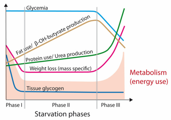 An examination of the physiology of starvation is relevant to an understanding of the syndrome of cancer CAS and potential treatments. As shown in Figure 1, three fasting/starvation phases can be defined based on a particular pattern of body mass loss and the substrates being metabolized [14,15]. Phase I is short, ranging from many hours to a week, with increasing reliance on body stores of glycogen, lipids, and protein as well as progressive depletion of glycogen stores to maintain glucose availability. Within 24 h, glycogen stores of the body, especially in the liver, are utilized by up to 85% to provide energy. Glycogen metabolism is replaced by gluconeogenesis (GNG), where required carbon chains are mainly supplied by muscle proteins [15,16]. Then, progressively, metabolic activity is slowed, together with protein utilization [14,15]. The human body adapts its consumption of energy reserves during the decreased caloric intake and fat free mass (FFM) of starvation by decreasing resting energy expenditure (REE).